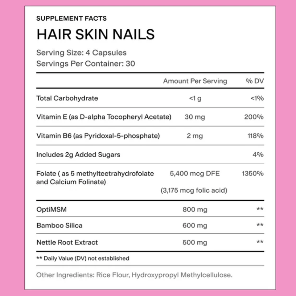 This skin-loving blend is powered by acne-friendly, clinically-backed ingredients like MSM for supporting collagen, Silica for shine, Nettle Root Extract for hair volume, Folate for hair strength, and Vitamin E for skin-supporting nourishment.